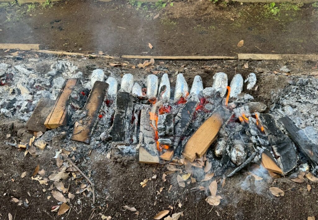 その後、すみれ・そら・やまぐみは本園へ移動し、やきいもに参加。