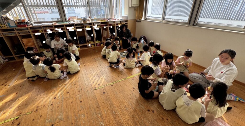 焼きたてのお芋は輪になって、みんなでいただきました。
